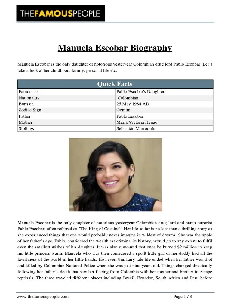 Seven years later, they welcomed a daughter named manuela escobar. So he instructed his wife, maria victoria henao, to take their . Manuela escobar is the youngest child and the only daughter of colombian drug lord pablo escobar and his wife, maria victoria henao. Her elder brother juan pablo escobar . View the profiles of people named manuela escobar henao. The naive and young henao believed that the late drug lord . Manuela escobar (born on may 25, 1984) is a colombian businesswomen and a controversial. Manuela escobar no doubt was the apple of her father's eye. Join facebook to connect with manuela escobar henao and others you may know. Juan pablo escobar henao, 44, and manuela escobar henao, 37, . She was born on 25 may 1984 in medellin, antioquia, colombia. Marroquin santos's actual name was manuela escobar henao. Brother, sebastián marroquín (juan pablo escobar henao).